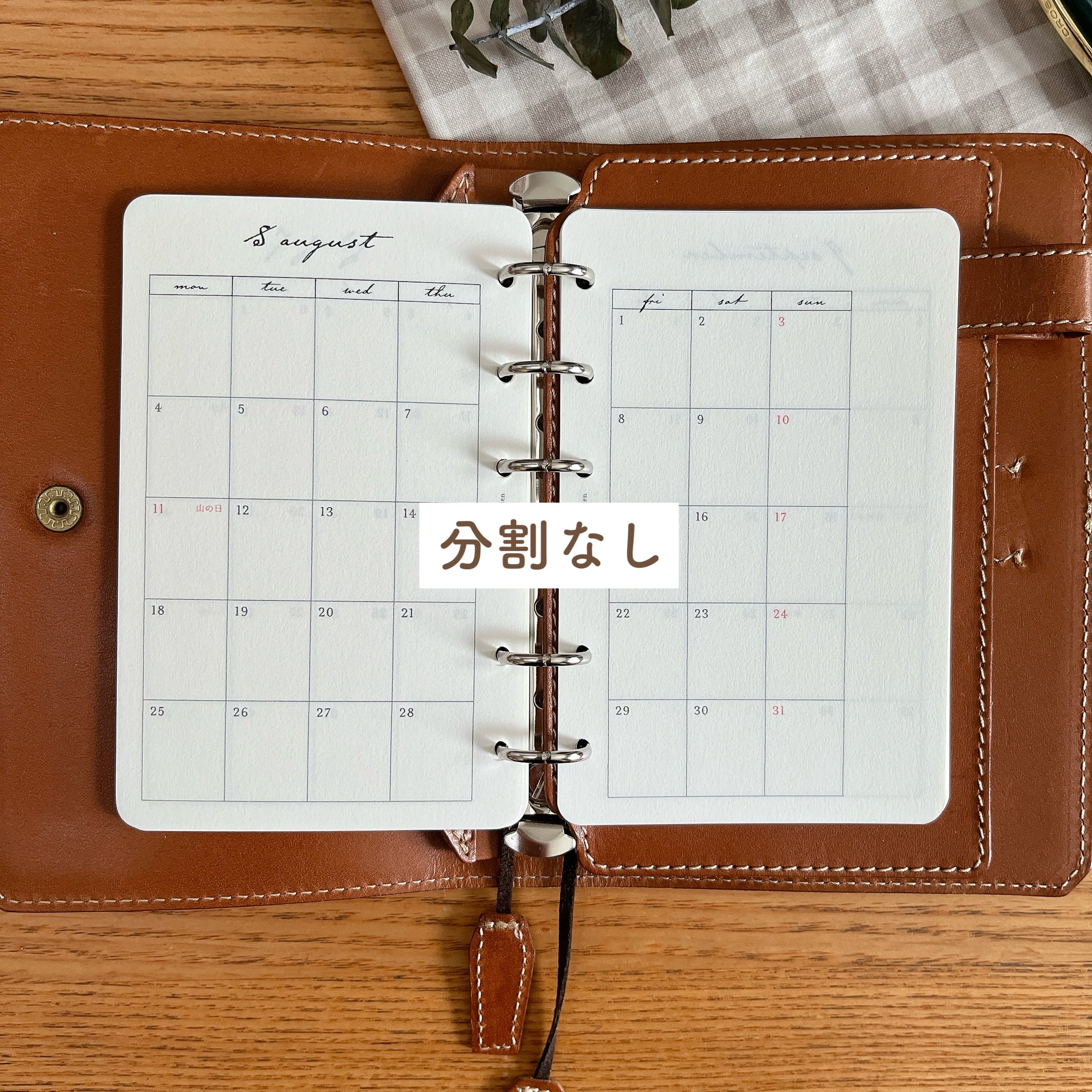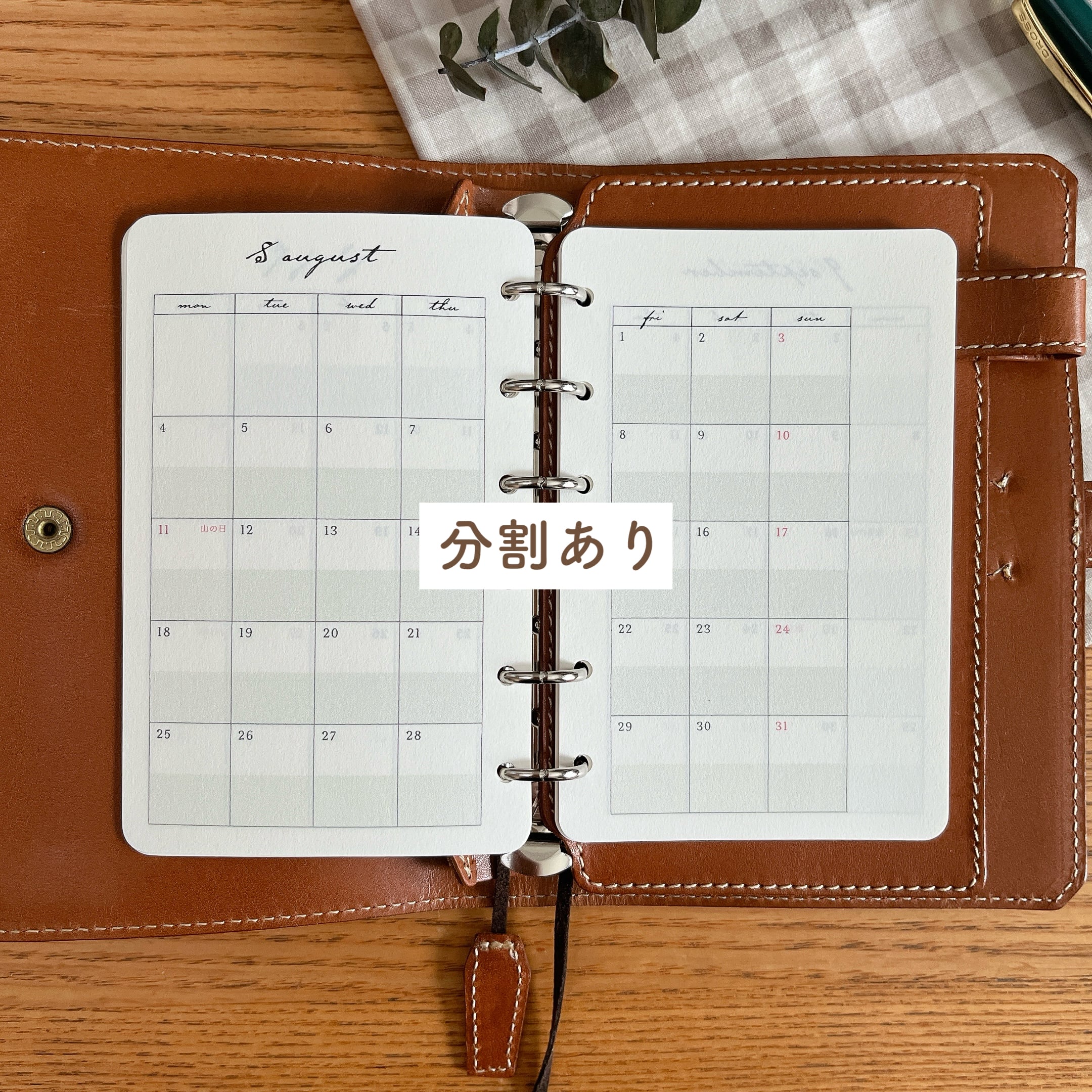 ご購入の際に、各日付のマスをグレージュの背景で上下に分けた『分割あり』か、背景なしの『分割なし』の選択をお願いいたします。